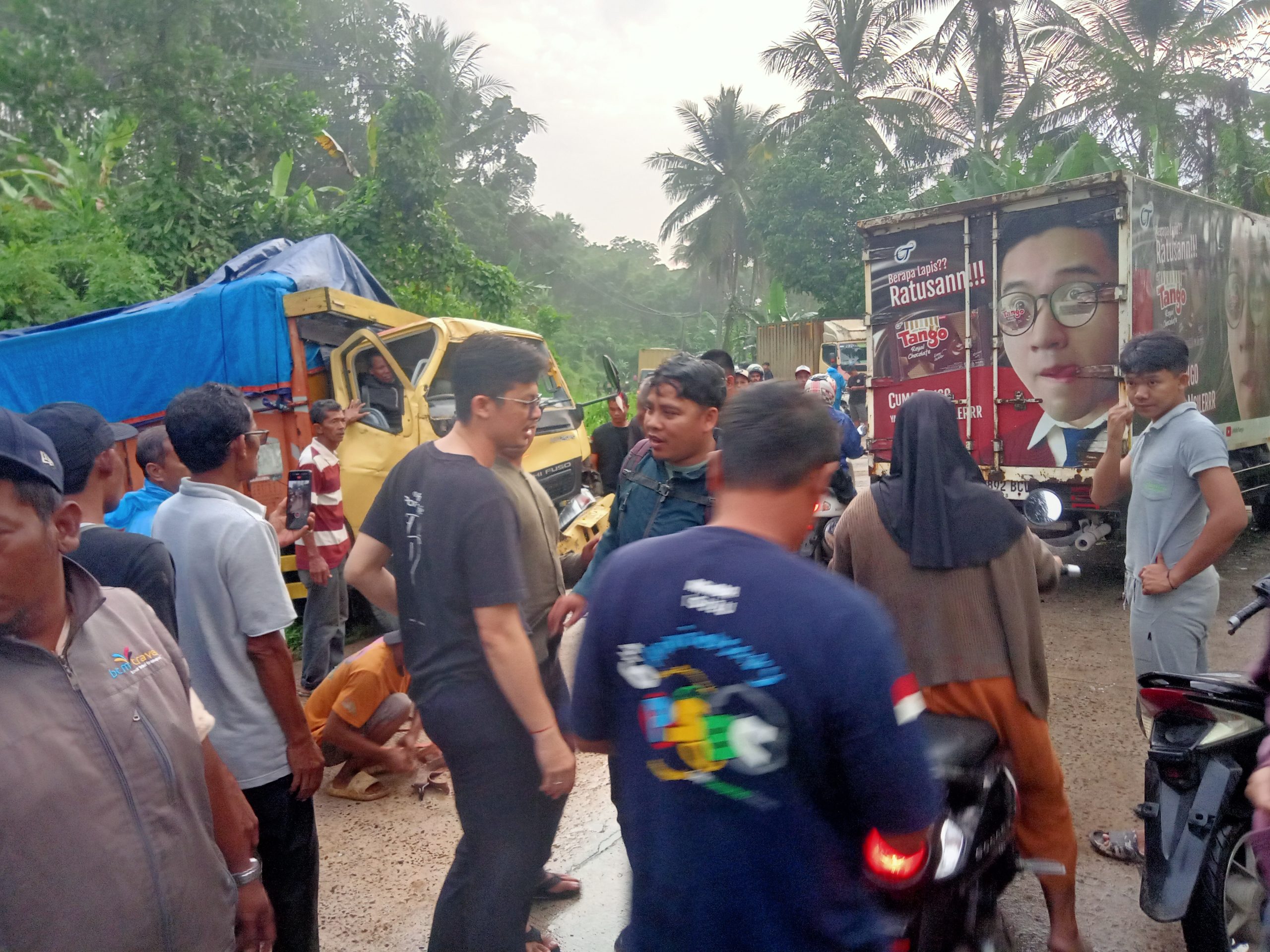 Polisi dan warga berupaya menyelematkan supir truk yang terjepit di mobil nya,darah menetes namun berkat usaha warga dan polisi,supir truk berhasil dikeluarkan dari dalam mobil nya.
